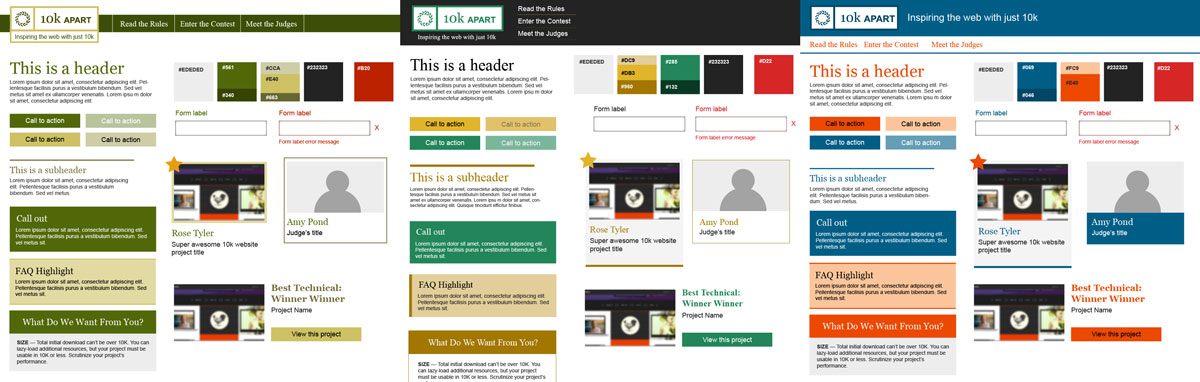 The green monochromatic style was developed after looking at An Event Apart and the original 10k Apart website from 2010. The colors were mostly muted with the exception of the buttons, which were red to draw your eye. Ultimately this direction didn’t provide enough contrast between elements with the monochromatic scheme.