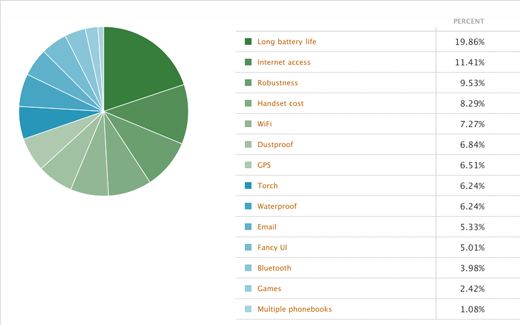 With nearly one fifth of the total votes – just under 20 per cent – Long battery life made it to the top as your most-needed feature in a phone for the next billion. We’re really not surprised by this result, as it’s vital to keep mobile devices powered in places where electricity is scarce or unreliable.