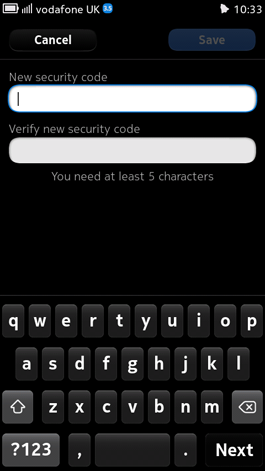 At the top of that option list is the Autolock feature, which is where you can have your Nokia N9 ask for a security code every time you awaken the phone from its sleep – or when trying to unlock the screen, anyway. If you want, you can have the phone ask for the security code every single time you do this, or after certain time intervals, such as: 5 minutes; 10 minutes; 30 minutes; or 60 minutes, if you so wish. I’ve now set up mine to do this automatically and with no interval. When selecting this option – or any other in this menu – the Nokia N9 asks you to create a security code.