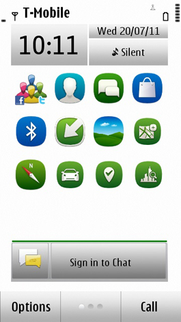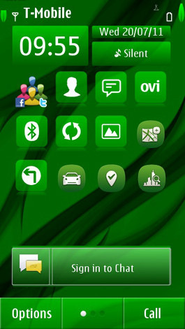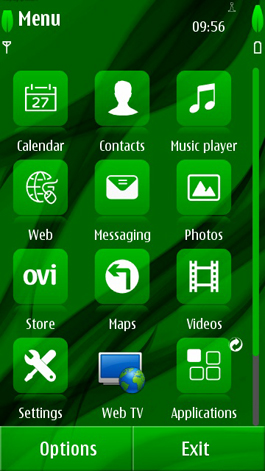 Green. That’s the one word you need to remember with this theme. And to be honest, you could hardly forget as you’ll see from the screenshots, below. Loaded onto my black Nokia N8 the green instantly makes your screen stand out. However, I imagine this would look much better on a green Nokia N8. The icons have been redesigned to square green ones, that are slightly transparent, which allows for the background to show through. Speaking of the background, the dark green strands of what looks like plant matter sit atop a lighter lime green background. Nice. If you like green.
