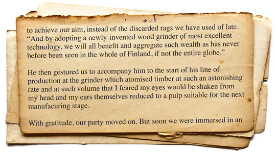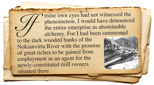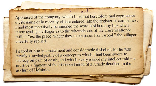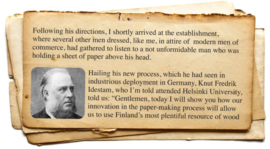 HELSINKI, Finland – Ever wondered what the first Nokia World must have been like? Well, after a bit of research, we’ve come up with this account from an agent who attended a new factory for a top secret briefing at Nokia World in 1867. He describes with total awe, his first glimpse of revolutionary technology introduced by Nokia to Finland in 1865 which turned wood into paper. Here’s how we thought it would’ve looked.