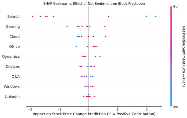 このセンチメントと株価変動の潜在的な因果関係をさらに深く理解し、パターンを可視化するために、SHAP (SHapley Additive exPlanations) の蜂群図を使用して、株価変動にセンチメントの方向性を対応付けました。このグラフの各点は、特定の四半期内の事業セグメントを表しています。赤い点は非常に肯定的なセンチメント、青い点は否定的なセンチメントを示しています。横軸は SHAP 値で、各事業部門のセンチメントがモデルの株価変動予測にどの程度寄与しているかを示しています。ゼロから遠い値ほど影響が大きいということです。