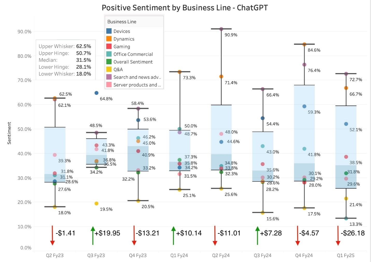 まず、Copilot を使用してマイクロソフトの四半期決算説明会のトランスクリプトを切り離し、事業部門別に分類しました (Devices、Dynamics、Gaming、Office Commercial、Search & News Advertising、Server Products and Cloud Services、Q&A、Overall Sentiment)。各セグメントは ChatGPT 4o を使って処理し、事業部門レベルでセンチメントを評価しました。ChatGPT-4o がセンチメント分析ツールに選ばれたのは、出力に一貫性があり、標準化された単一の Python ワークフローで数四半期分のトランスクリプトを効率的に処理できるためです。Copilot のセンチメントの精度が最も高かったものの、API アクセスがなく、入力を手動に頼ることになるため、大規模な分析には向かないという結論に至りました。それに迫る ChatGPT-4o の高いパフォーマンスと優れたアクセシビリティを考慮した結果、ChatGPT-4o が分析を実行するうえで最も現実的な選択肢となりました。