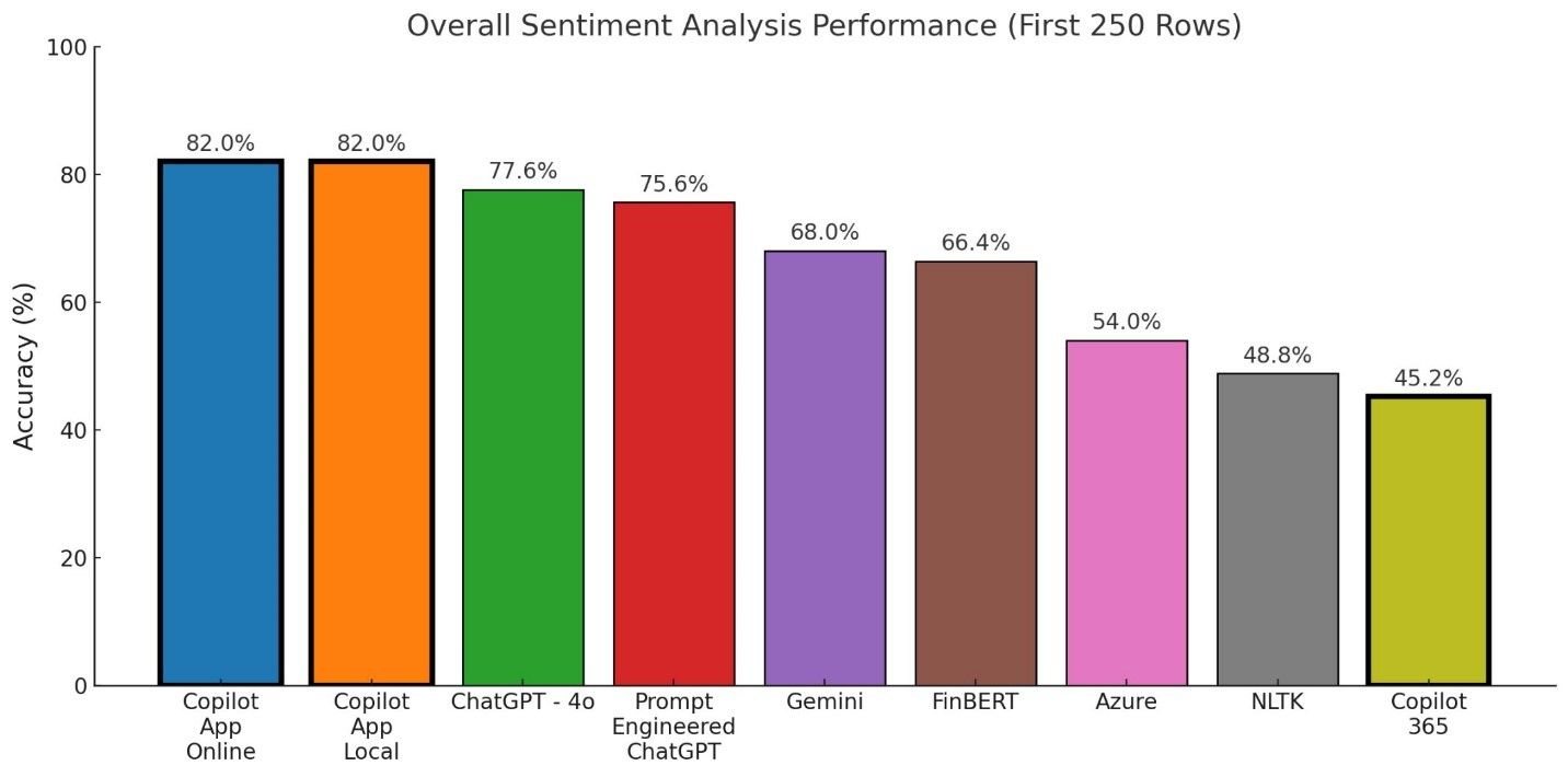 各モデルはこのデータセットの同じ文章を分類しました。金融・財務関連の文章は、書式の一貫性を確保するために、従来の NLP ライブラリ用に前処理されました。LLM ベースのツール用には、実世界での適用を反映するために、同一のプロンプトを使用しました。各モデルが一文ごとにセンチメントを返した後、事前にラベル付けされたデータセットに対する正しい分類の割合である精度を測定しました。Copilot Desktop App と Copilot Chat のインターフェイスは、ローカルで実行する場合も Web 経由でアクセスする場合も「Think Deeper」機能が使用されましたが、Microsoft 365 では「Think Deeper」機能を使用できませんでした。