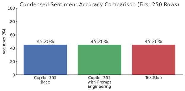 このベンチマーキングでは、Microsoft 365 版の Copilot の精度が他の LLM センチメント モデルよりも低くなりました。調査したところ、Copilot Desktop App と Web でホスティングされた Chat は、LLM ベースの計算能力に依存していた一方、Copilot 365 は主要なセンチメント分析ツールとして既定で TextBlob Python ライブラリを使用していたことが判明しました。しかし、Copilot 365 が主に Microsoft 365 スイートの主要な機能を最適化、拡張する目的で設計されていることを考えれば、当然の結果とも言えます。