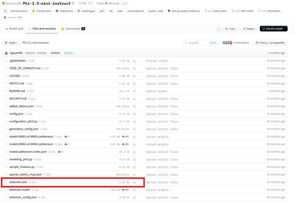 • トークナイザー ファイルを探す: Hugging Face のページで、Phi-3.5-mini-instruct モデルのトークナイザーを見つけます。