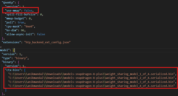 • コピー先の HTP バックエンド ファイルを編集し、soc_model と dsp_arch の値を自分の構成に合わせて変更します。