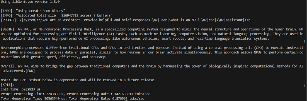 1./genie-t2t-run.exe -c genie_config.json -p "<|system|>\nYou are an assistant. Provide helpful and brief responses.\n<|user|>What is an NPU? \n<|end|>\n<|assistant|>\n"