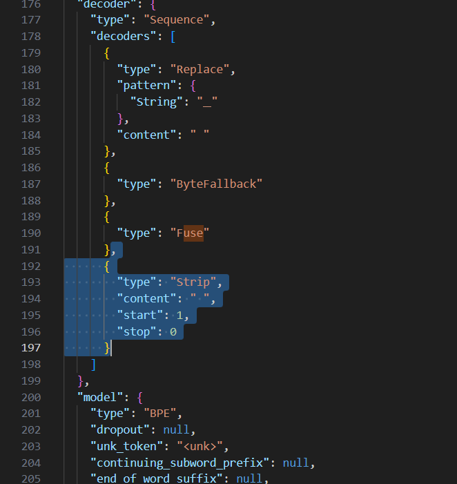 : Phi-3.5-mini-instruct モデルの tokenizer.json ファイルには、出力において空白による単語の区切りが行われないという問題があります。これを解決するためには、tokenizer.json ファイルの 192 ~ 197 行目を削除します。