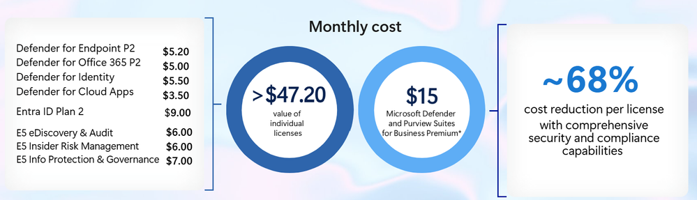 新しい Microsoft Defender および Purview Suites は、Microsoft Defender と Purview の全機能を単一のコスト効果の高いパッケージに統合します。このオールインワン ソリューションは、製品を個別に購入する場合と比較して最大 68% のコスト削減を SMB のお客様にもたらすのと同時に、包括的なセキュリティ、コンプライアンス、データ保護を提供します。これにより、機能や予算を妥協することなく、これまで以上に組織を保護することが容易になります。
