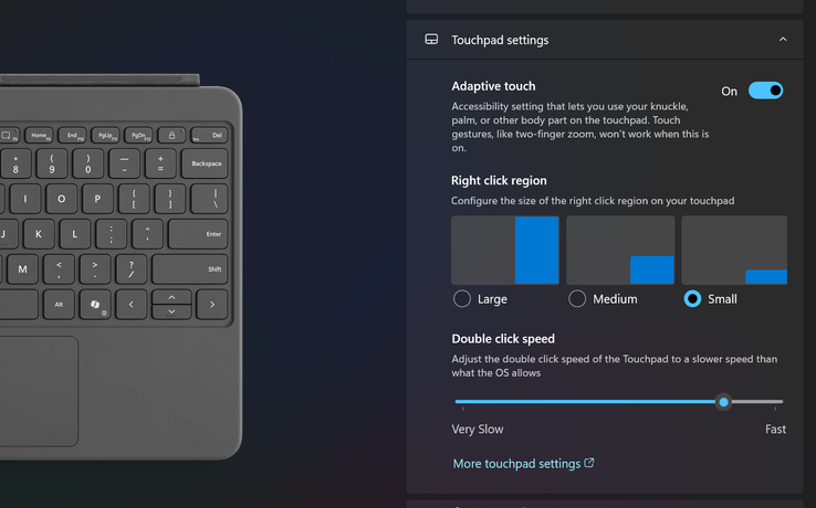 もう 1 つの変更が、アダプティブ タッチ モードです。このモードは、Surface タッチパッドに直接組み込まれており、Surface アプリで簡単にオンオフを切り替えることができます。関節炎などによる可動域制限、肢体不自由、脳性麻痺のある方の多くは、標準的なタッチパッドが使いにくかったり、使えなかったりします。アダプティブ タッチ モードは、そのような状況を変えるものです。