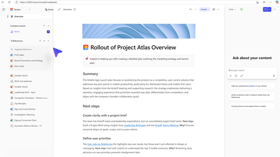 推奨される参考資料として、関連するファイル、メール、会議メモが自動的に表示され、ノートブックの内容を充実させることができます。これにより、複数の情報源を探し回ることなく、最も役立つ関連資料をすばやく取り込めます。この機能は 12 月から順次提供を開始しています。