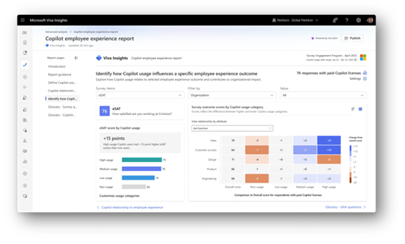 Copilot の利用状況が従業員エンゲージメントとどのように関連しているかを、管理者が把握できるようになりました。Copilot 従業員エクスペリエンス レポートは、Copilot の利用状況と、Viva Glint で可視化される従業員センチメントとの関連性を分析し、うまく機能している点と改善が必要な点を明らかにします。管理者は、Viva Glint の調査から得られる主要指標を基に独自の分析を行い、大きな効果につながる機会や、従業員が意義を感じながら仕事にかかわれるようにする機会を見いだすことができます。このレポートを使用するには、Microsoft 365 Copilot と Viva Glint が必要です。この機能は 11 月から提供を開始しています。