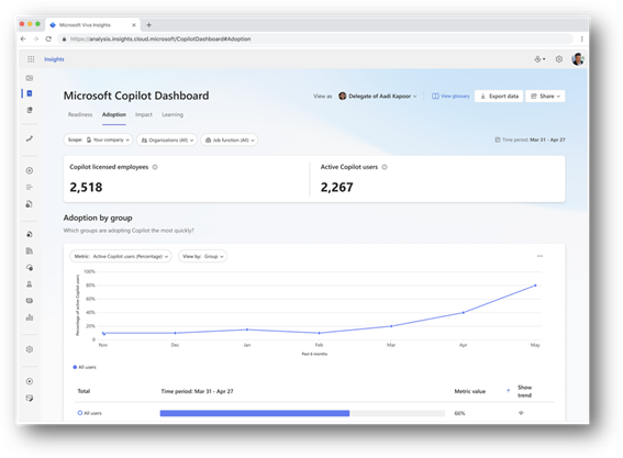 Copilot ダッシュボードで Copilot Chat の導入状況を追跡できるようになりました。総ユーザー数、利用傾向、グループ別の導入状況、利用の度合い、定着率、アプリ別の内訳を確認できます。組織属性ごとに指標を確認してグループ別の導入パターンを明らかにすることで、管理者は Copilot のライセンスを最適化し、効果的に利用を促進できます。今回の更新は、50 以上の Microsoft 365 Copilot ライセンスをお持ちで Copilot ダッシュボードにアクセスできるお客様向けに 11 月から提供を開始しています。
