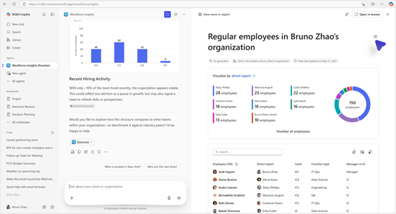- Workforce Insights エージェント: 次のアクションにつながる組織インサイトを提供します。リーダーはあらかじめ用意されているプロンプトによってチーム構成、レベルのバランス、スキル分布を明確に把握し、人材管理の取り組みに役立てることができます。このエージェントは 12 月に Frontier プログラムで提供を開始しています。