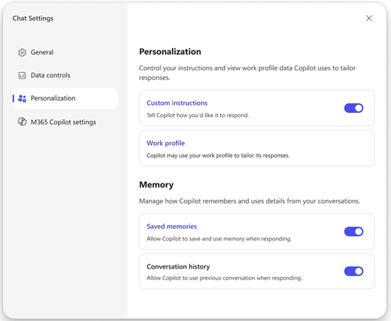 Work IQ のメモリ機能が強化され、Copilot との会話の記録を呼び出すことができるようになります。この新しい設定により、状況に即した関連性の高い応答が返されるようになると共に、ユーザーは自分の好みに合わせて簡単に Copilot の応答を調整、カスタマイズできるようになります。このメモリ機能は Work IQ (Microsoft 365 Copilot が各ユーザー、ユーザーの業務、組織について隅々まで理解することを可能にするインテリジェンス レイヤー) の一部であるため、Copilot がユーザーの仕事の進め方をより深く理解し、パーソナライズして適応できるようになります。この機能は 12 月から順次提供を開始しています。