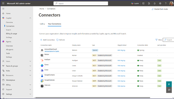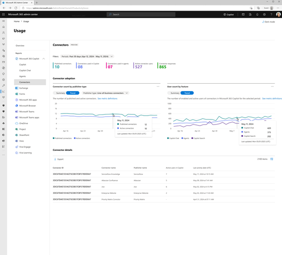 Microsoft 365 管理センターのコネクタ使用状況レポートでは、コネクタによって Microsoft 365 Copilot エクスペリエンスがどのように強化されているかについての情報が提供され、アクティブなコネクタの数や、コネクタを参照するエージェントなどの指標を確認できます。日ごとの傾向、コネクタの応答回数、個々のコネクタの利用状況に関するインサイトを得ることで、トレーニングの最適化、導入戦略の改善、効果の高い機能統合の特定などが可能になります。この機能は 3 月から順次提供を開始します。
