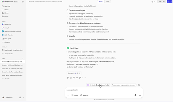 インテリジェント サマリーのセクションでは、うまく機能している箇所や、Copilot の導入を加速するために注力すべき領域をすばやく確認できます。導入状況の主要な傾向が明らかになるため、成果が出ている部分にフォーカスできます。また、プロンプトの提案を受けて、根底にある傾向や促進要因を掘り下げて分析することが可能になります。この機能は 3 月から順次提供を開始します。