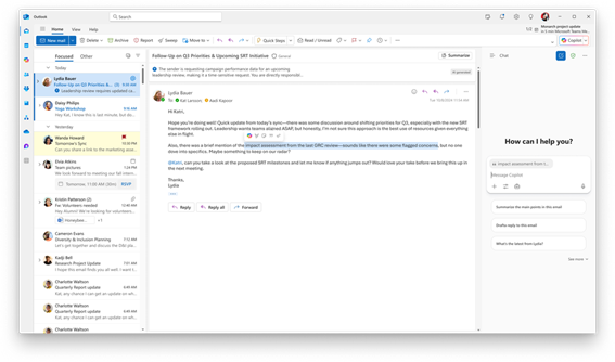 Outlook (クラシック) では、Copilot が提示するリアルタイムのインサイト、文脈の要約、関連ドキュメントを活用して、会議の準備を整えることができるようになりました。Copilot とチャットしながら、予定されている会議に向けた入念な準備を行い、万全の態勢で会議に臨むことができます。この機能は 1 月から Outlook (クラシック) でパブリック プレビューを開始しており、3 月から世界中で順次提供を開始する予定です。