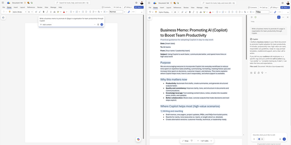 さらに、Word で [Edit with Copilot] が自動的に有効化され、空白のドキュメント上で Copilot に指示して文書作成を始められるようになりました。これによって作業に取りかかる際の手間が減り、AI の支援を受けながら、流れを止めずに文書を洗練させていくことができます。この機能は 2 月から提供を開始しています。