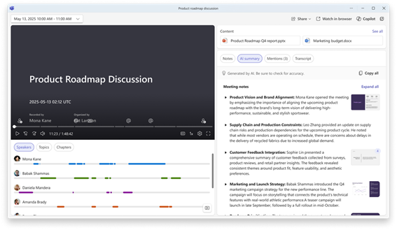 会議の要約の AI サマリーに、議論に影響を与えた視覚要素が含まれるようになりました。会議の録画中に画面を共有すると、重要な瞬間の画面がキャプチャされ、会議の要約の該当セクションに並べて表示されるため、議論中に見ていた画面を再確認できます。メモはこれまでと変わらず会話の内容に焦点を当てたものですが、そのアイデアの方向性が定まったときに示されていた視覚的文脈も一緒に整理されるようになります。その結果、より直観的に要約を振り返ることが可能になり、録画内を行ったり来たりして確認することなく、会議での決定事項とそのとき画面に表示されていた情報をすばやく結び付けることができます。この機能は 2 月から順次提供を開始しています。