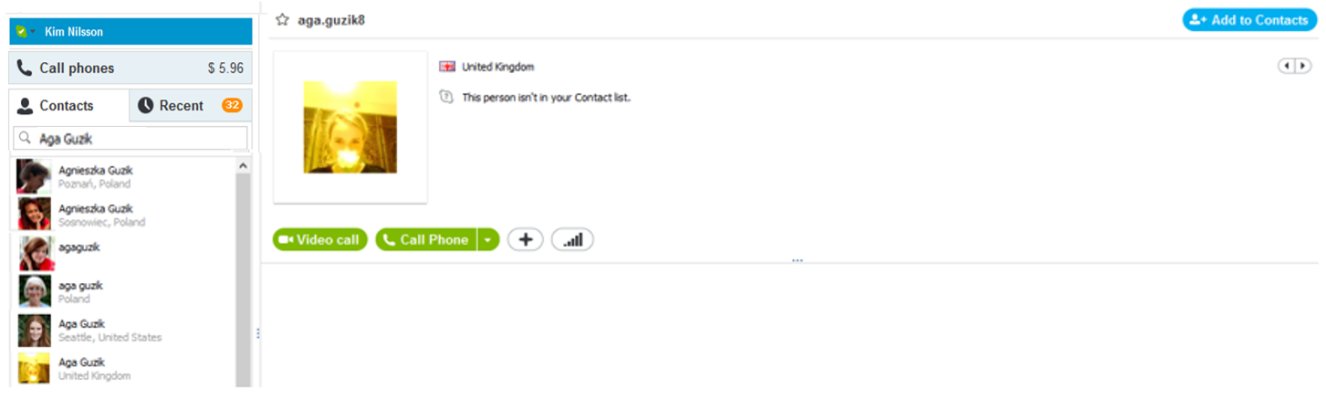 Perfil para contacto en Skype – misma información de contacto y estatus