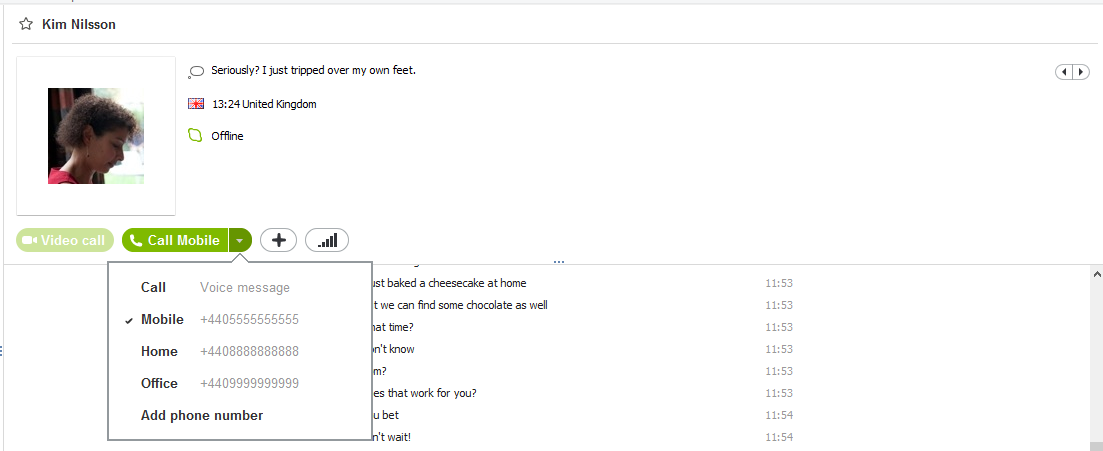 Mantente en contacto con tus amigos de Skype.Cuando quieras llamar a alguien de tu lista de contactos de Outlook que ya esté en Skype, puedes enviarle un mensaje instantáneo, llamarlo por teléfono o a través de videollamada. Para hacerlo necesitan estar en tu lista de contactos de Skype.