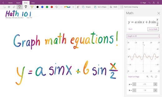 Mejoren sus habilidades matemáticas con Ink Math Assistant**. OneNote puede resolver ecuaciones matemáticas y mostrarles los pasos para encontrar la respuesta. Puede incluso graficar la ecuación y calcular la mínima, máxima o intersección de ejes. Si quieren convertir la ecuación a texto escrito, pueden hacerlo también.