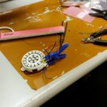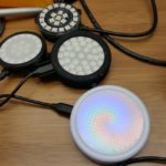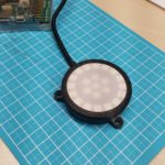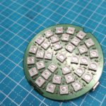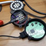 - La primera versión del dispositivo fue una pantalla simple que consiste en 16 pixeles dispuestos en un anillo. En esta parte del proceso de prototipo, se utilizó una cortadora artesanal para cortar piezas circulares de material difusor para cubrir las pantallas que difunden los brillantes LEDs.