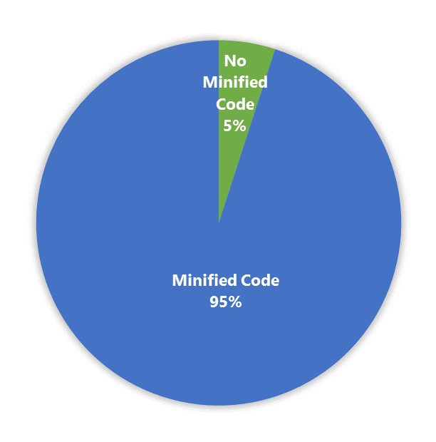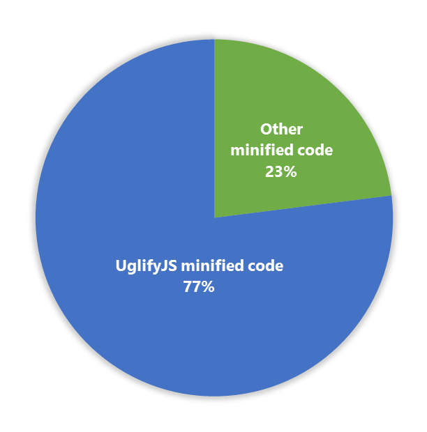 Given the advantages of reducing the size of content to be pulled down to a client (browser), usage of minified JavaScript code is common in today’s web. While investigating a particular performance issue during the Windows10 release, one of the things we found was that some instances of minified code (minified using UglifyJS) were not performing as well as their non-minified equivalent were. In some cases minifiers use code patterns that we thought developers typically don’t use, which is why Chakra had not optimized for the same. So we did a quick experiment to see how common minification is on the web. Out of the top 10,000 sites, we took a random sample of around 4,000 sites and below is what we found: