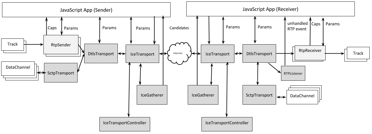 The below diagram is part of the Overview section in the ORTC API spec. It provides a very high level summary of the relationships between ORTC objects, and a useful illustration of a code flow, from capture media stream tracks as input to the RtpSender objects, and all the way to the media stream tracks out of the RtpReceiver objects that can be rendered to video/audio tags. We recommend using the diagram as a reference when you start learning ORTC API.