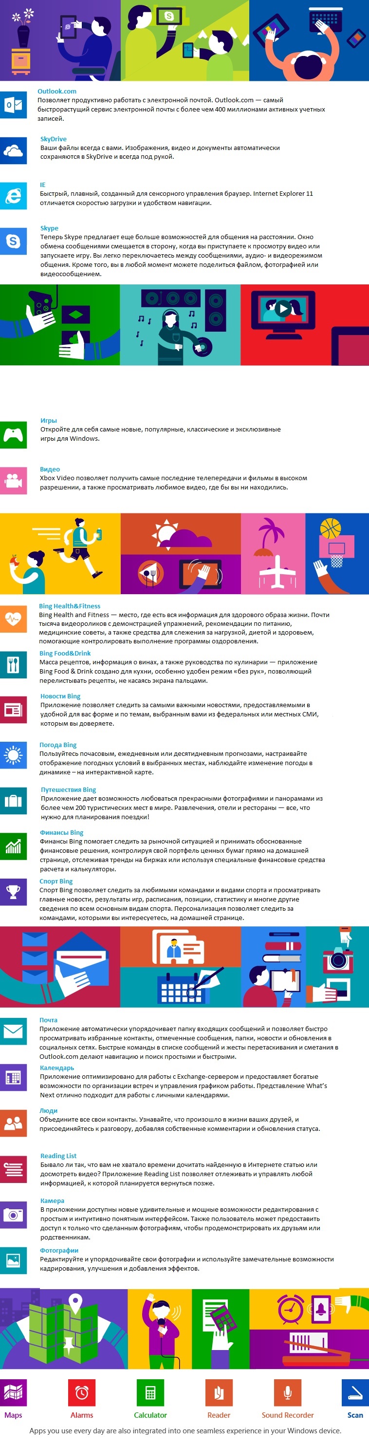 Мы создали постоянно расширяющийся набор базовых приложений и сервисов. Bing, Skype, Internet Explorer, SkyDrive, Outlook.com, Xbox Music, Видео и Игры – предлагают полезные возможности для всех пользователей Windows-устройств. Каждое приложение интересно само по себе, однако настоящее волшебство происходит, когда они используются совместно, плавно перетекают одно в другое и формируют единый пользовательский опыт.
