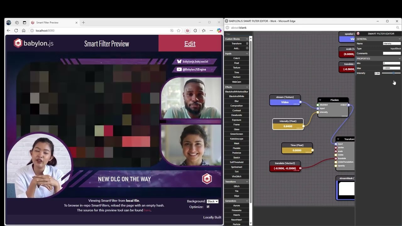 Babylon.js 8.0 builds on our rich library of node-based creation tools with the introduction of Smart Filters and the Smart Filter Editor. This new tool allows you to create video filters, texture treatments, post-processes, you name it. If it’s a 2D visual effect, this tool is for you! Under the hood it leverages shaders in the same way you’d expect any of our GPU-based tools to do, but it focuses on helping you create elaborate 2D visual treatments for web experiences. We can’t wait to see what you make with this exciting new tool!